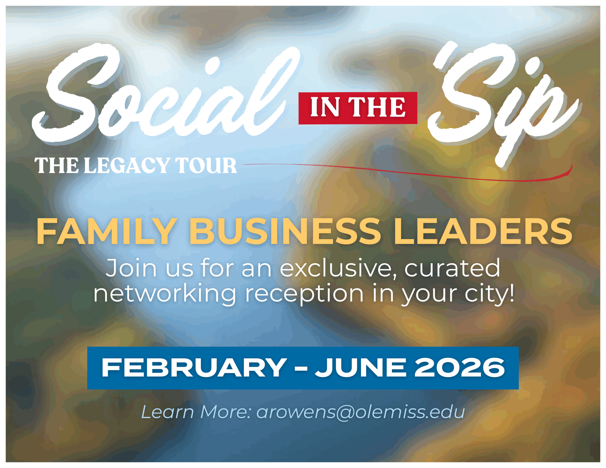 The Social in the ‘Sip Legacy Tour is an exclusive, traveling networking series designed to connect, empower, and engage Mississippi’s family business community. Hosted across the state, each refined reception features insightful conversations, key industry experts, and actionable takeaways focused on navigating the complexities of family business success. This is a targeted opportunity for leaders to build genuine connections and gain strategic perspectives.